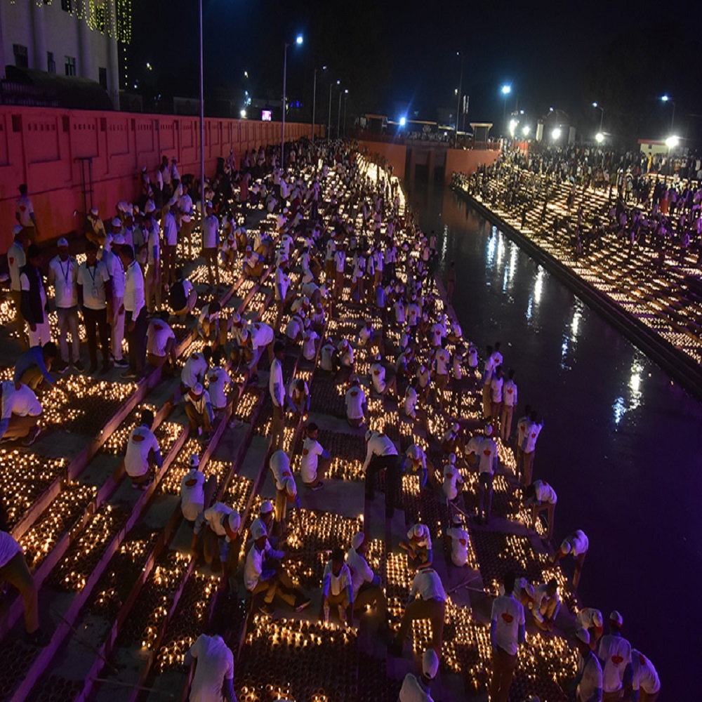 Ayodhya comes alive during the dazzling Deepotsav festival, a night where thousands of diyas bathe the city in a warm glow. Artists dressed as divine figures like Shree Ram, Sitaji, and Lakshmana, grace the occasion, filling the air with a sense of reverence. Along the Saryu River, the gentle flicker of diyas creates a peaceful ambiance. Deepotsav